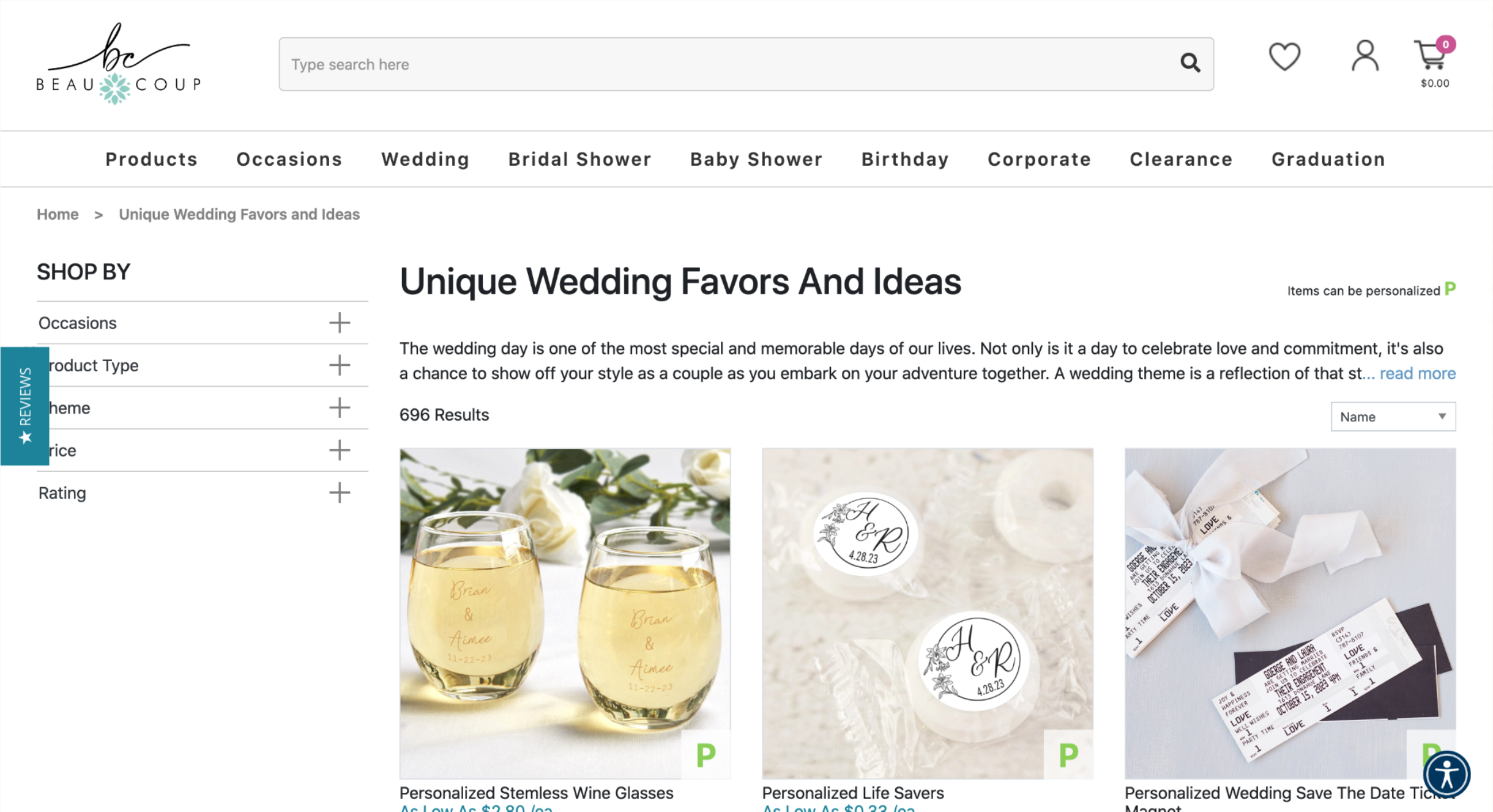 Although each website sells wedding accessories they have very different structures, categorizations, sorting and filters. My Wedding Favors structured their main navigation with a mix of wedding related categories. The cards across the bottom of the screen act as a type of sub-menu with additional wedding related categories to sort the shop by. Within their shop people could sort and filter in a variety of ways.