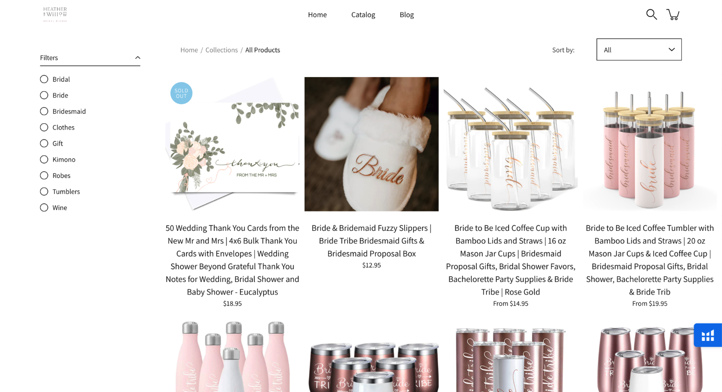 Since Heather & Willow is a small ecommerce shop with only 26 items, their top navigation consists of a link to home, their catalog, and their blog. The filters on their catalog are specific to their focus on bridesmaids items. Their sort options are in line with the other two websites though.