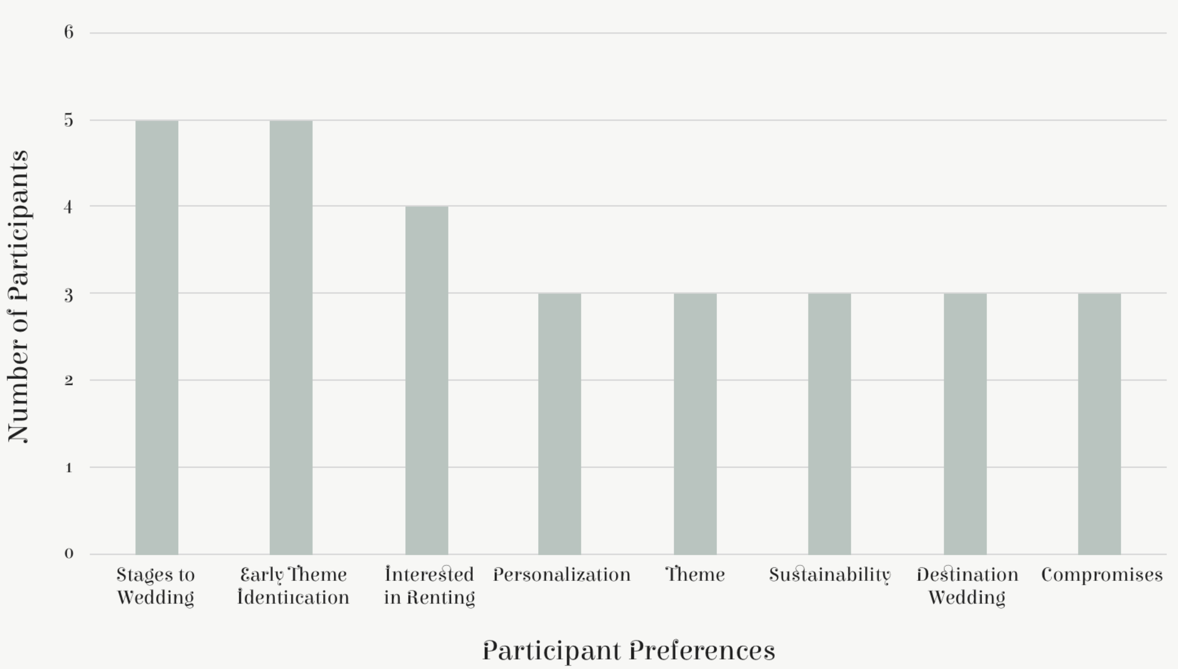 We looked for consistency and variance from our user interviews compared with our hypotheses. Most people had the same stages to the wedding, in wedding, ceremony and reception. They identified themes to their wedding early in the process too, although these themes were more likely to be based on the location or the venue than any ‘Theme.’ The majority of our participants were interested in renting wedding materials they didn’t personalize, although many of these people had to make compromises because of the venue or due to their wedding being a destination wedding. There was also a passing interest in sustainability.