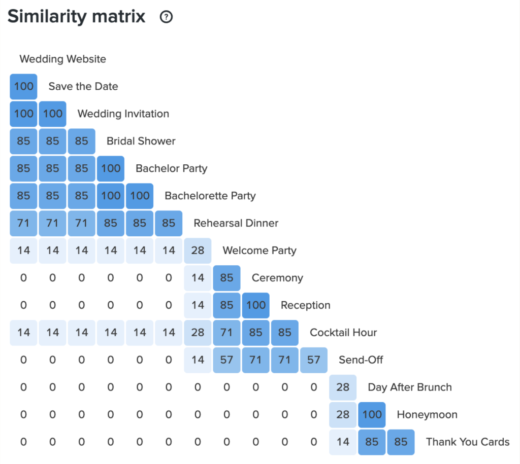 There was a high degree of consistency with how participants categorized items into the closed sort, pre-wedding, wedding, and post wedding categories. The minor variances were with less popular wedding activities including the welcome party, the day after brunch, and to a lesser degree, the send off.
