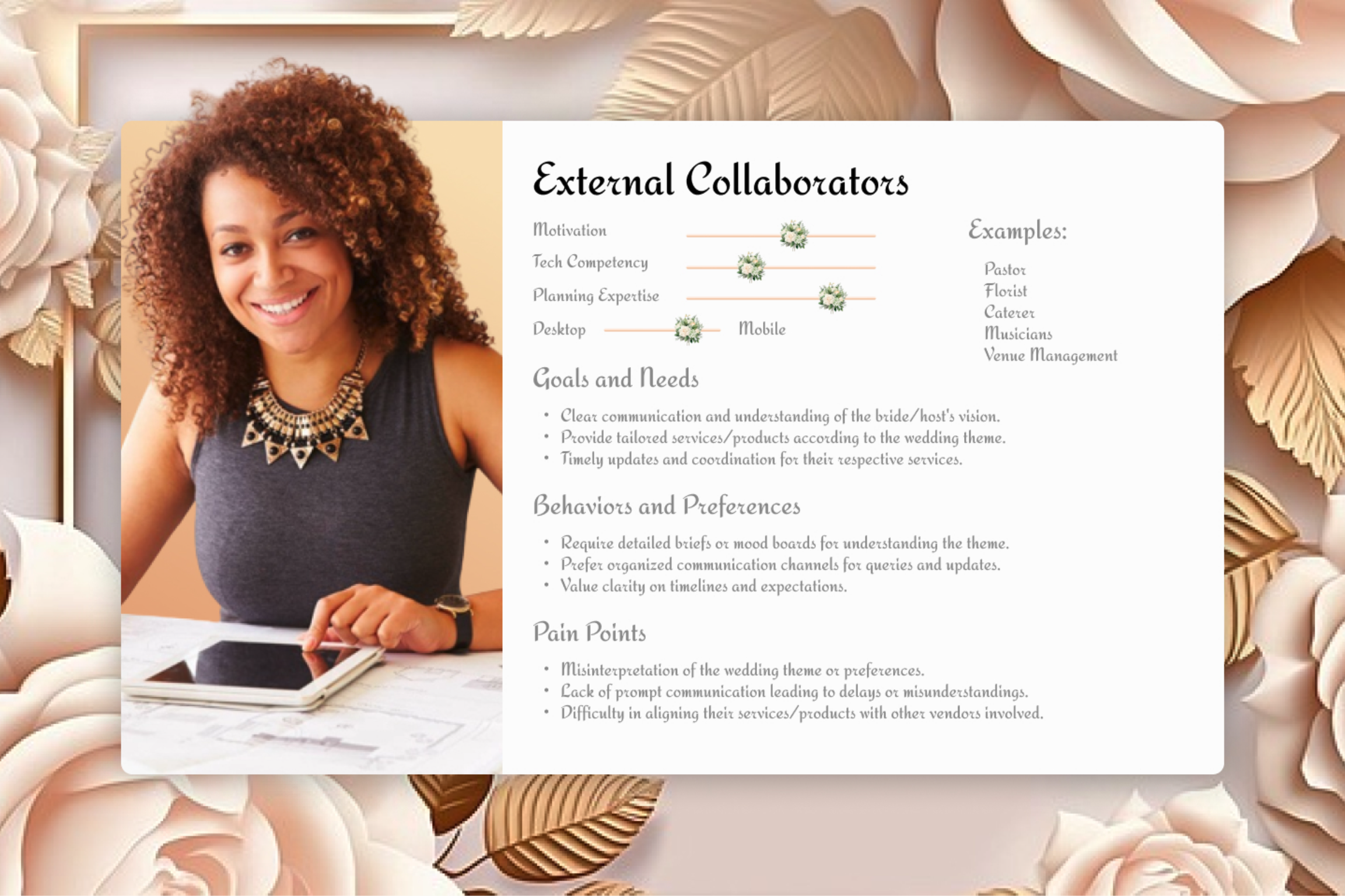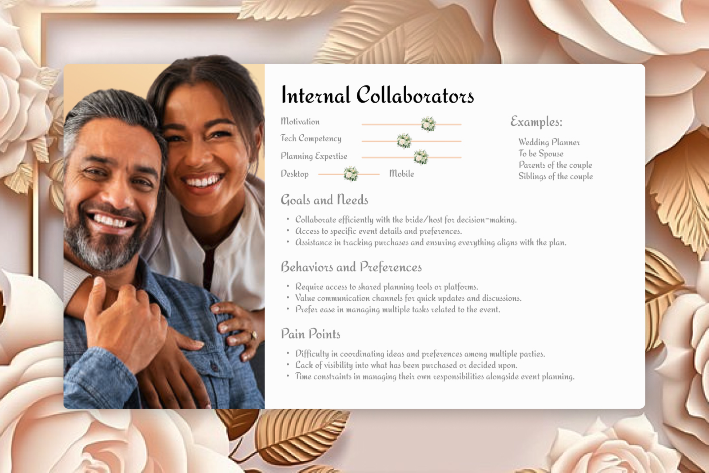 Internal collaborators were one of the secondary personas, with wedding planners and the hosts spouse as top examples. Their goals are to collaborate with the host in decision making while not impeding the host’s decision making power.