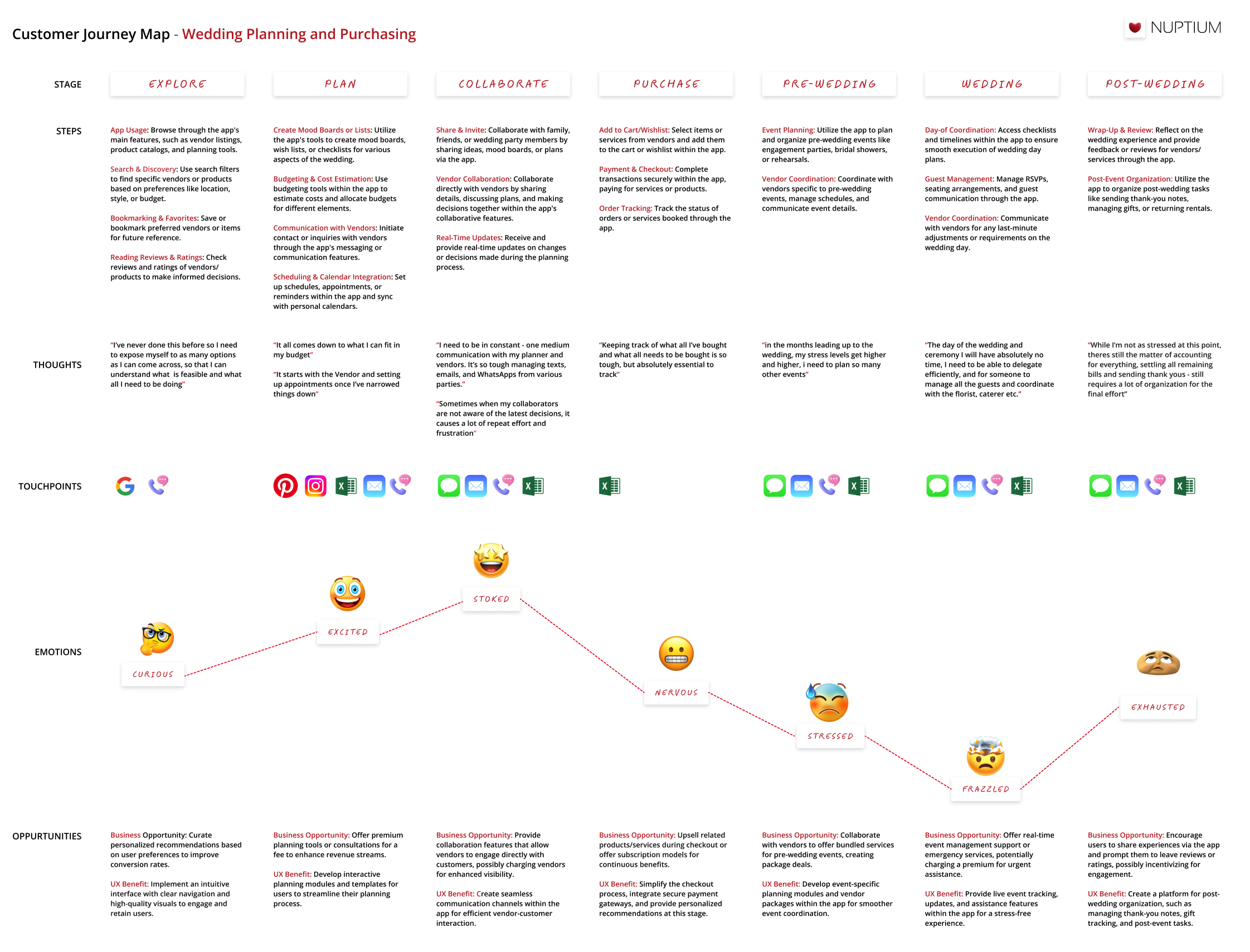 We built the journey map to develop empathy for our primary persona, the bride, within the confines of the wedding planning and purchasing process. We defined the stages and steps of the journey map with input from the card sorting activity and used the interviews we conducted to inform people’s thoughts, touch-points, and emotions. The combination of the data informed both the business opportunities and the UX benefit. It’s tough to see on the sheet. The opportunities we came up with were: