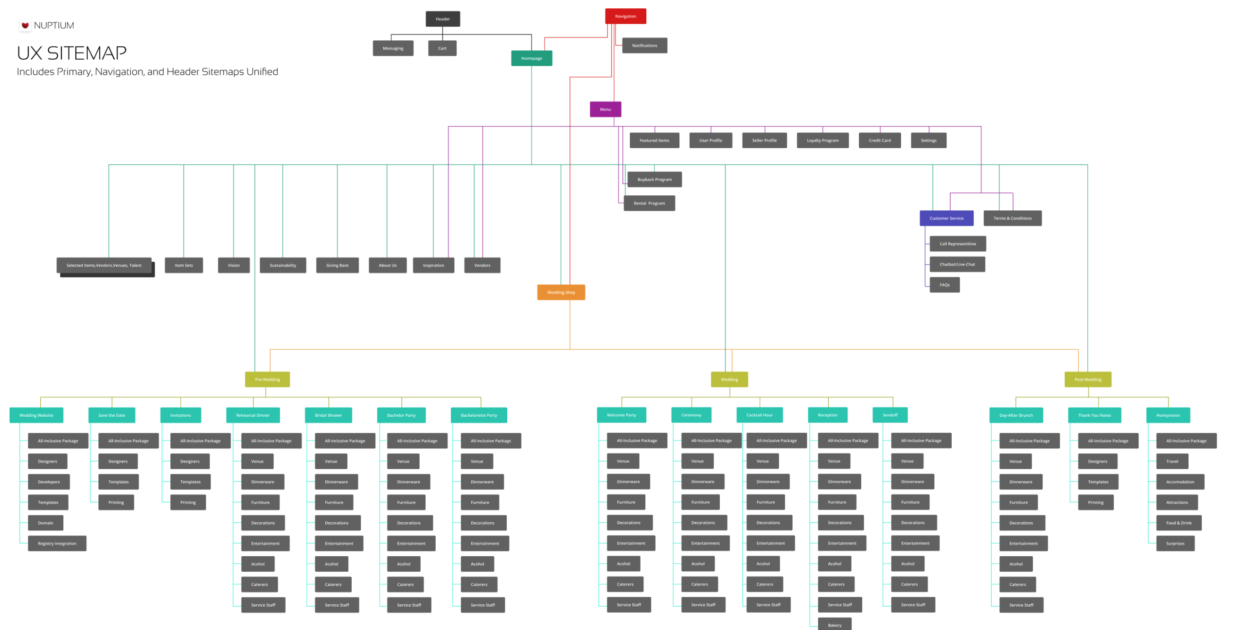 Our sitemap draws heavily from the card-sorting activity, particularly in defining the categories of pre-wedding, wedding, and post-wedding. We also followed their advice for the sub-categorizations as people sorted them within the card-sorting activity. Separate from the navigation structure was a messaging section, shopping cart, notifications, featured items, user profile, seller profile, loyalty program, credit card, settings, customer service, and terms & conditions.