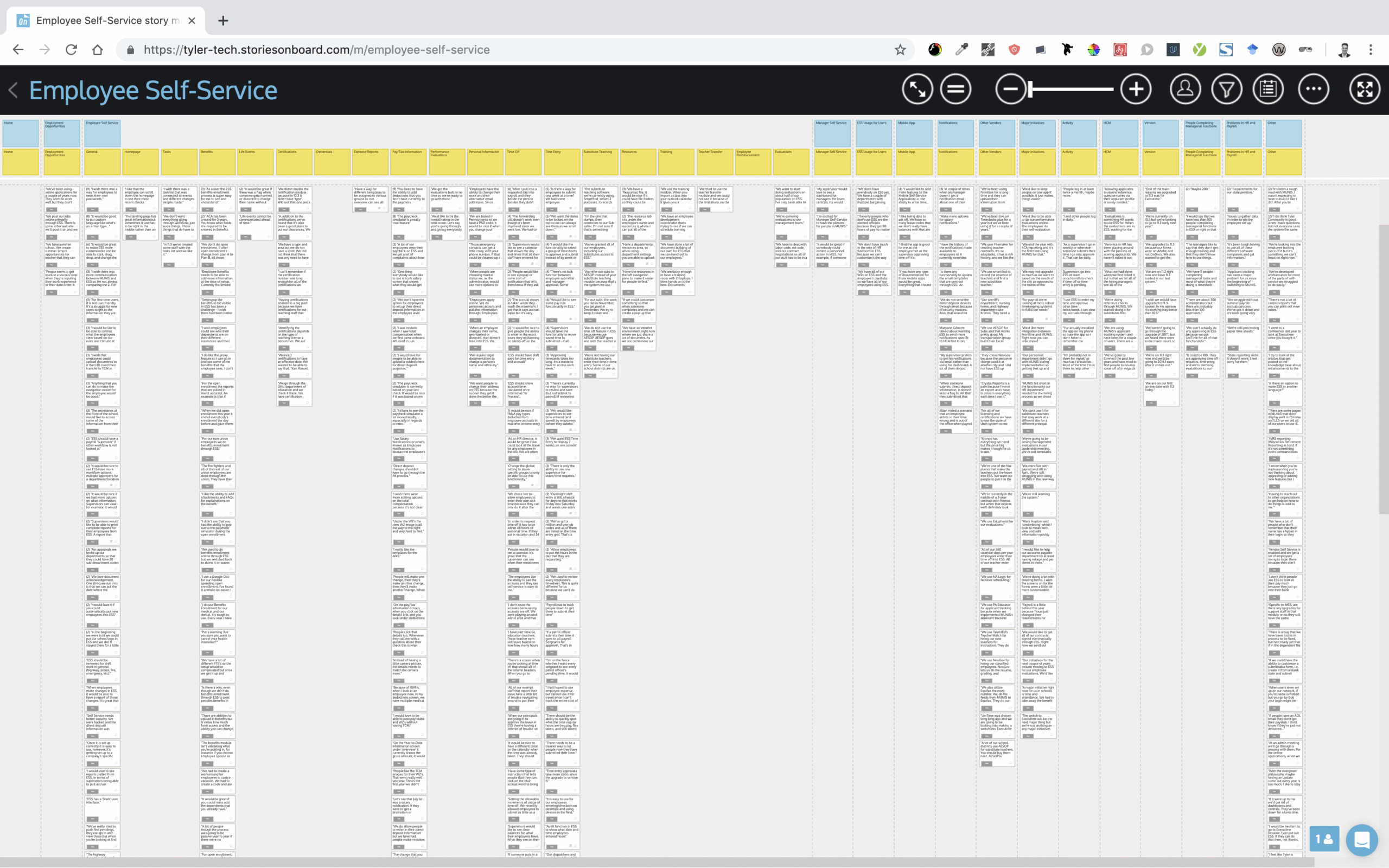 I recorded each interview with the participant’s permission of course, but I found it more effective to spend some time immediately after each session and jot my notes down on the Miro-like application Tyler used called StoriesOnBoard. What resulted was a giant note sheet that I quickly started organizing and bucketing into various categories both within, just outside and around ESS and Munis as applications. What resulted was a bucketed list by application and by category of the positives and negatives that interview participants and their cohorts encountered.