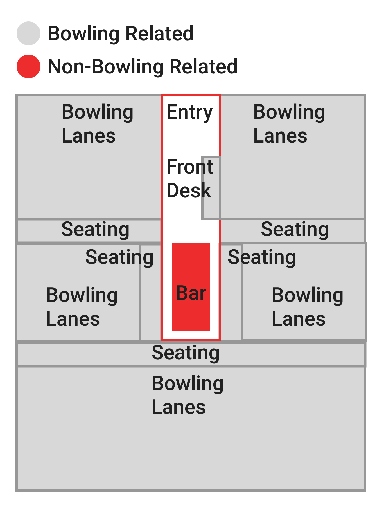 The obvious insight is to repurpose the copious amount of space dedicated to the open areas and to non-bowling activities, transforming it into additional lanes, which I’ve sketched below.