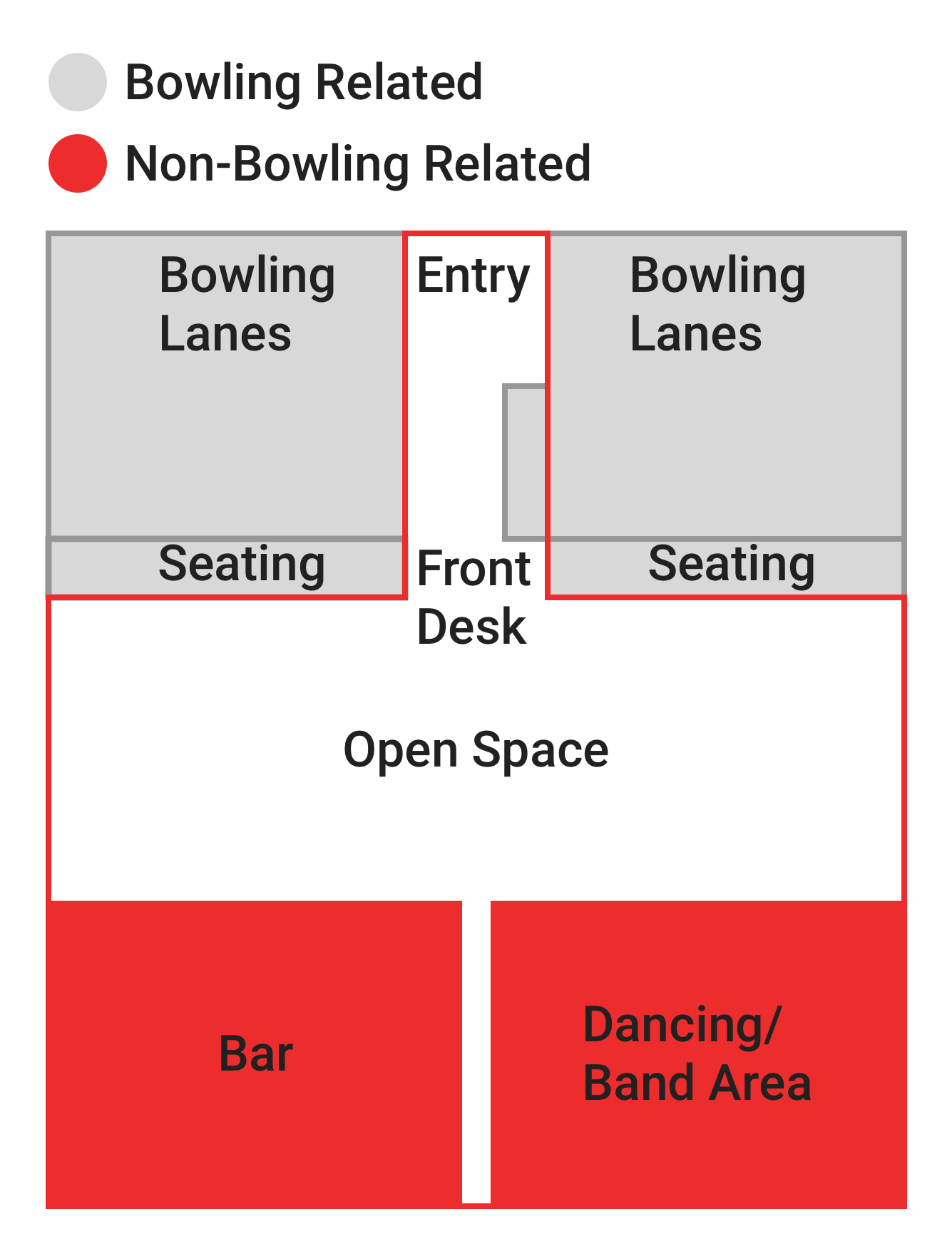 Although bowling alleys do not seem to have much trouble filling lanes, they do have issues filling the areas that don’t have any association with the activity of bowling. The ‘premier’ bowling alley in Portland, Maine is outfitted with 4 different bar areas, a dancing/live music area, a table-tennis area that comfortably fits 8 tables, and a rooftop bar/food-truck that is big enough to fit over 100 people. When I visited the alley for my ethnographic research, with the exception of a bartender in one of the downstairs bars, all of those ancillary areas were empty. The amount of wasted space was more than double the size of the space dedicated to the bowling lanes. I sketched the first floor of this bowling alley below.